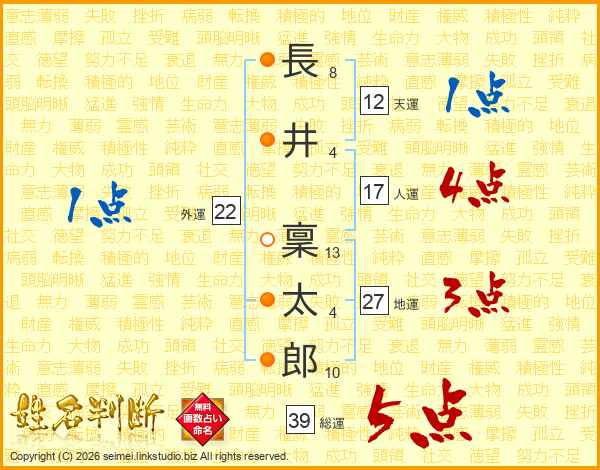 長(8画)井(4画) 稟(13画)太(4画)郎(10画)