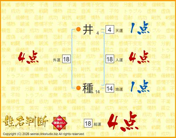 生活面を象徴する運勢です。外部から受ける影響力を表し、結婚運、家庭運や職場、環境への順応性を表します。総運から人運を引いた画数。姓や名が1文字の場合を除く。