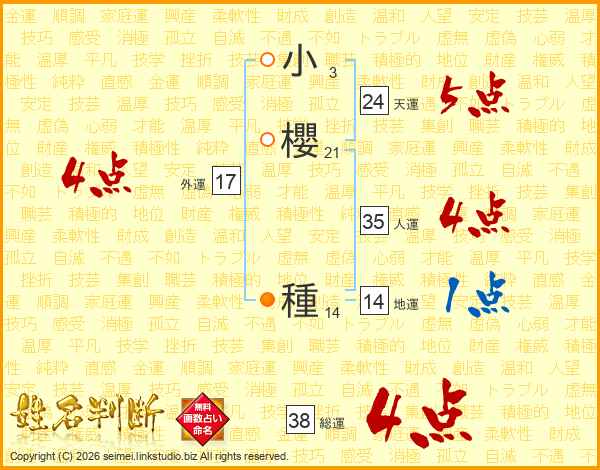 小櫻種さんの総運は38画の4点!