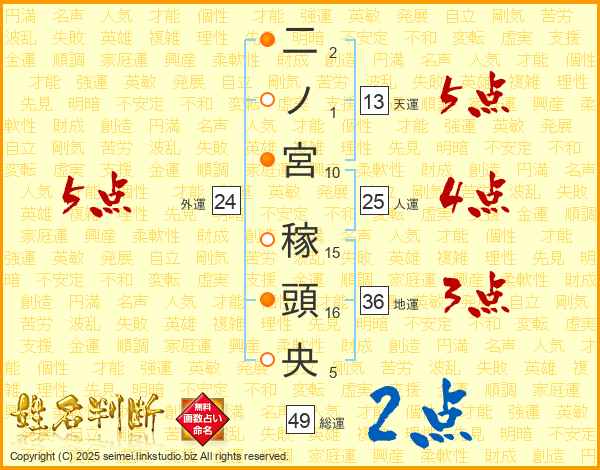 二(2画)ノ(1画)宮(10画) 稼(15画)頭(16画)央(5画)