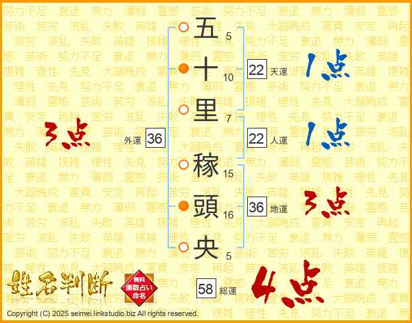 五(5画)十(10画)里(7画) 稼(15画)頭(16画)央(5画)