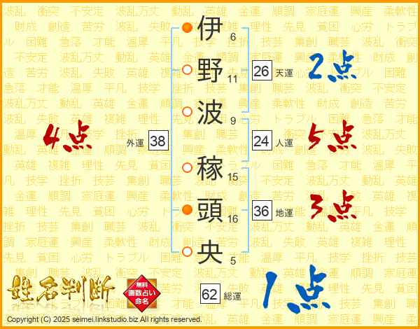 伊野波稼頭央さんの総運は62画の1点!