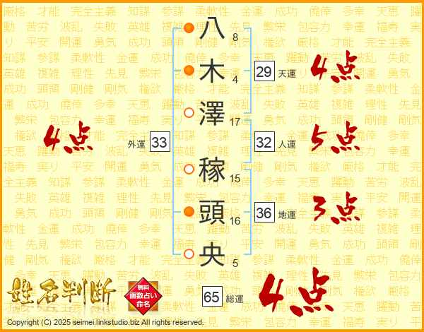 八(8画)木(4画)澤(17画) 稼(15画)頭(16画)央(5画)