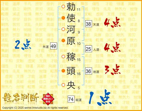 勅使河原稼頭央さんの総運は74画の1点!