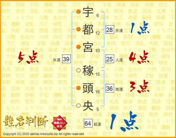 宇(6画)都(12画)宮(10画) 稼(15画)頭(16画)央(5画)