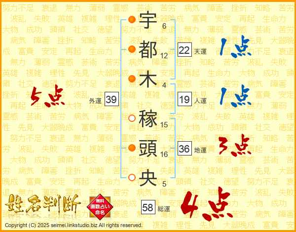 宇(6画)都(12画)木(4画) 稼(15画)頭(16画)央(5画)