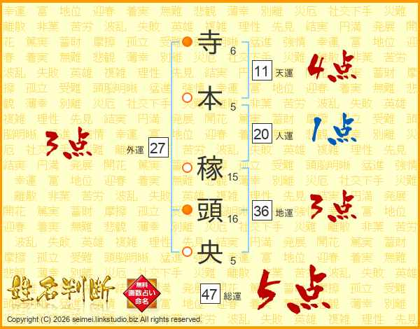 寺(6画)本(5画) 稼(15画)頭(16画)央(5画)
