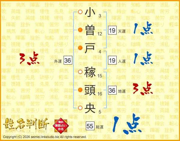 小(3画)曽(12画)戸(4画) 稼(15画)頭(16画)央(5画)