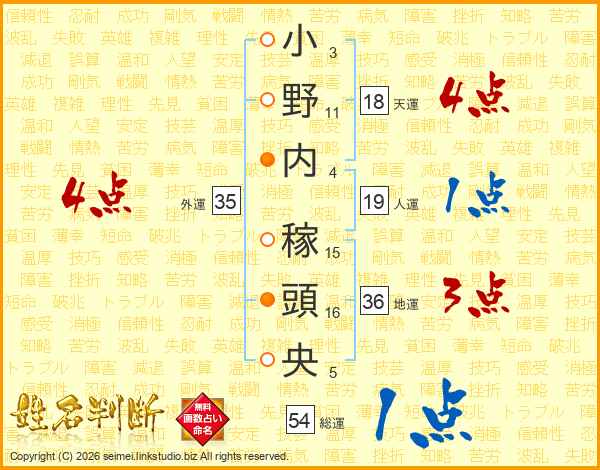 小野内稼頭央さんの総運は54画の1点!