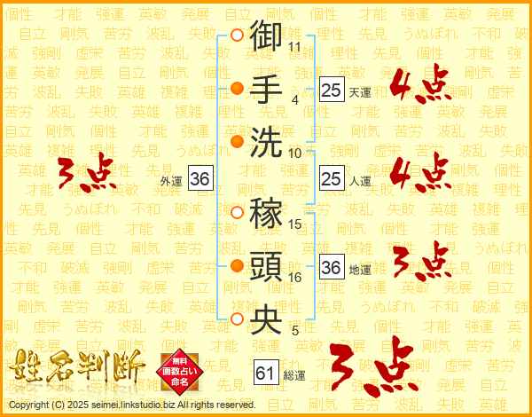 御(11画)手(4画)洗(10画) 稼(15画)頭(16画)央(5画)