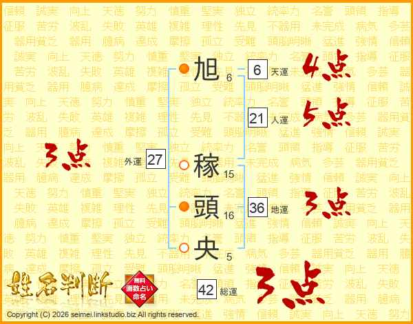 旭(6画) 稼(15画)頭(16画)央(5画)