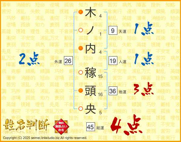 木(4画)ノ(1画)内(4画) 稼(15画)頭(16画)央(5画)