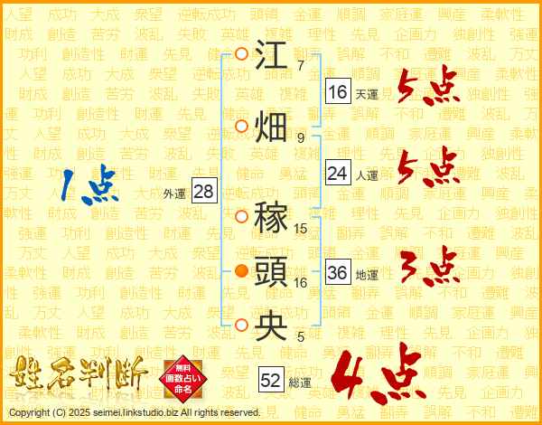 江畑稼頭央さんの総運は52画の4点!