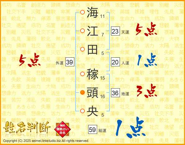 生活面を象徴する運勢です。外部から受ける影響力を表し、結婚運、家庭運や職場、環境への順応性を表します。総運から人運を引いた画数。姓や名が1文字の場合を除く。