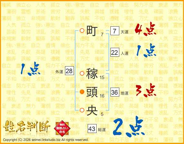 生活面を象徴する運勢です。外部から受ける影響力を表し、結婚運、家庭運や職場、環境への順応性を表します。総運から人運を引いた画数。姓や名が1文字の場合を除く。