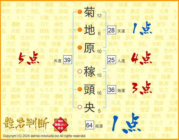 菊(12画)地(6画)原(10画) 稼(15画)頭(16画)央(5画)