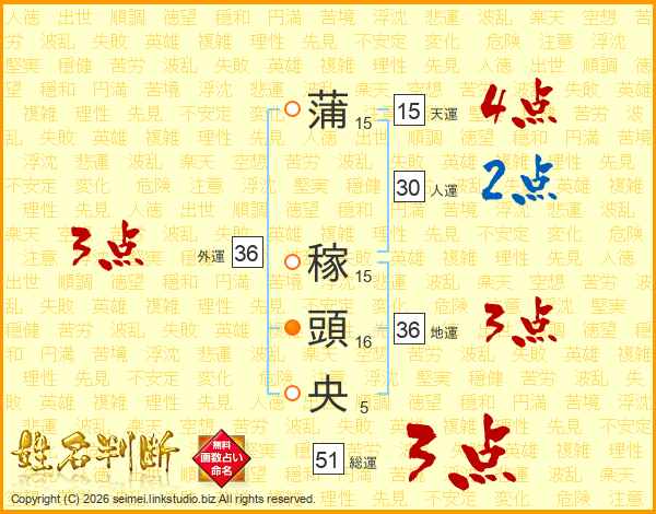 蒲稼頭央さんの総運は51画の3点!