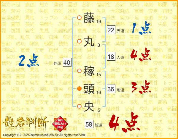 藤(19画)丸(3画) 稼(15画)頭(16画)央(5画)