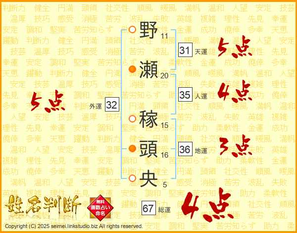野(11画)瀬(20画) 稼(15画)頭(16画)央(5画)