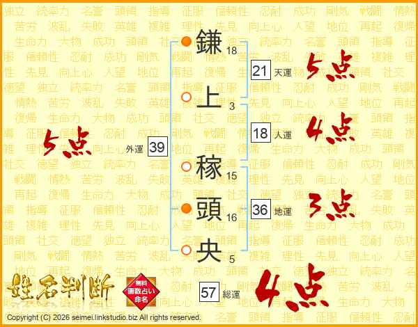 鎌上稼頭央さんの外運は39画の5点!