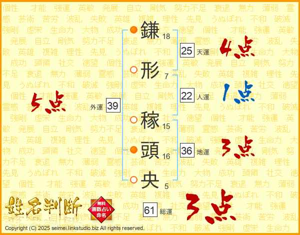 鎌形稼頭央さんの総運は61画の3点!