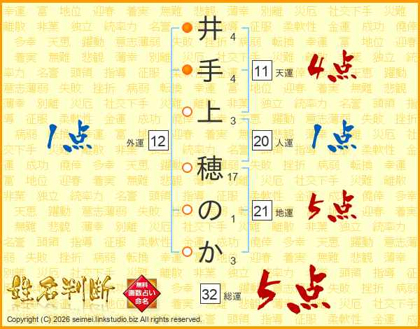 井手上穂のかさんの総運は32画の5点!