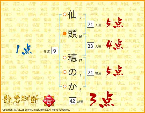 仙(5画)頭(16画) 穂(17画)の(1画)か(3画)