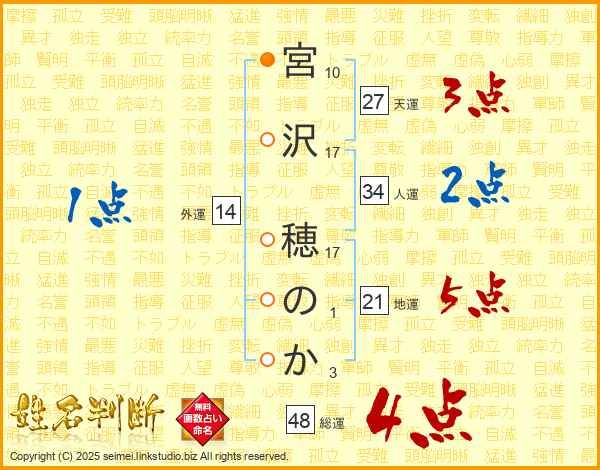 宮(10画)沢(17画) 穂(17画)の(1画)か(3画)
