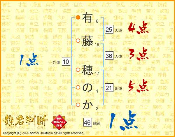 生活面を象徴する運勢です。外部から受ける影響力を表し、結婚運、家庭運や職場、環境への順応性を表します。総運から人運を引いた画数。姓や名が1文字の場合を除く。