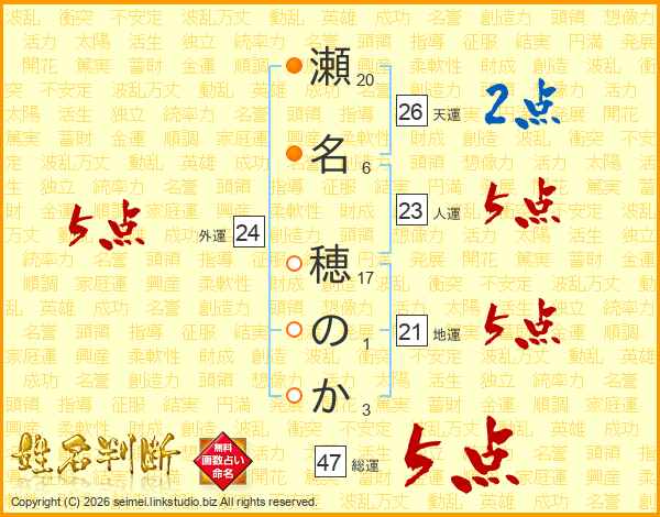 瀬名穂のかさんの総運は47画の5点!