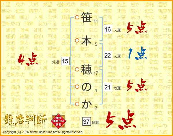 笹本穂のかさんの総運は37画の5点!