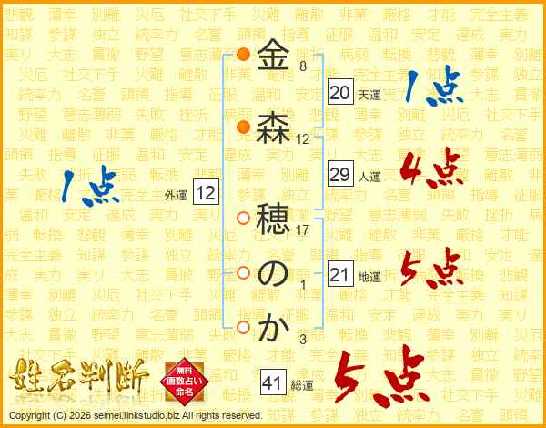 金(8画)森(12画) 穂(17画)の(1画)か(3画)