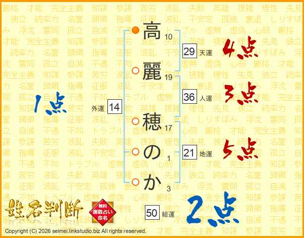 高(10画)麗(19画) 穂(17画)の(1画)か(3画)