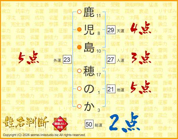鹿(11画)児(8画)島(10画) 穂(17画)の(1画)か(3画)