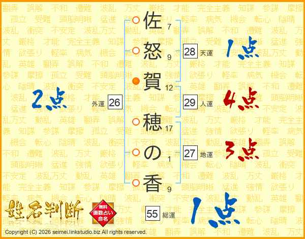 佐(7画)怒(9画)賀(12画) 穂(17画)の(1画)香(9画)