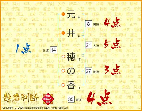 元(4画)井(4画) 穂(17画)の(1画)香(9画)