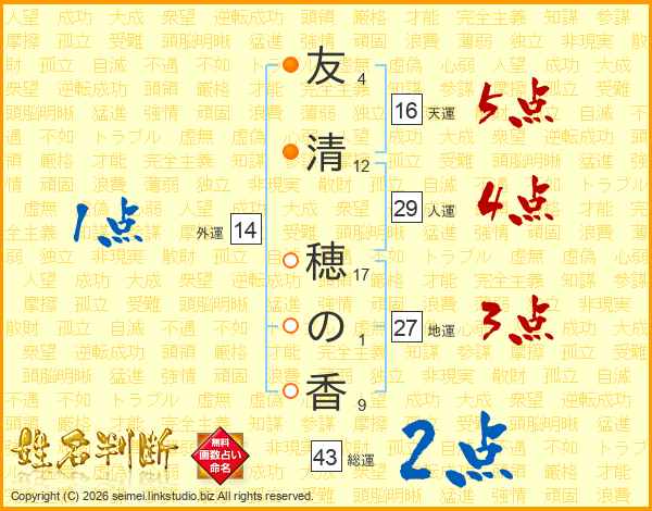 友(4画)清(12画) 穂(17画)の(1画)香(9画)