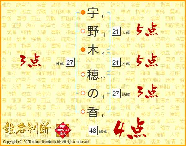 宇野木穂の香さんの総運は48画の4点!