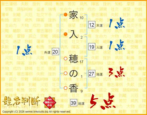 家(10画)入(2画) 穂(17画)の(1画)香(9画)