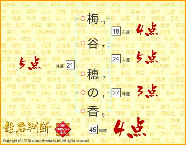 梅(11画)谷(7画) 穂(17画)の(1画)香(9画)