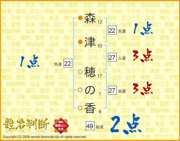 森(12画)津(10画) 穂(17画)の(1画)香(9画)