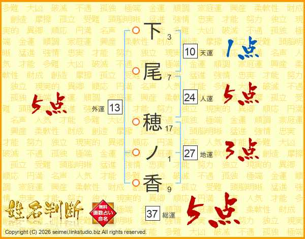 下(3画)尾(7画) 穂(17画)ノ(1画)香(9画)