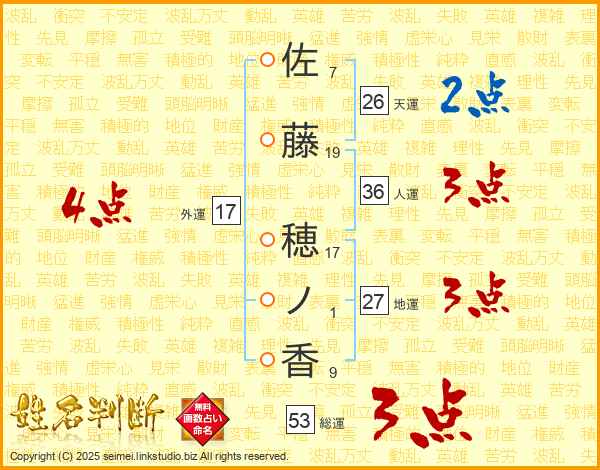 佐(7画)藤(19画) 穂(17画)ノ(1画)香(9画)