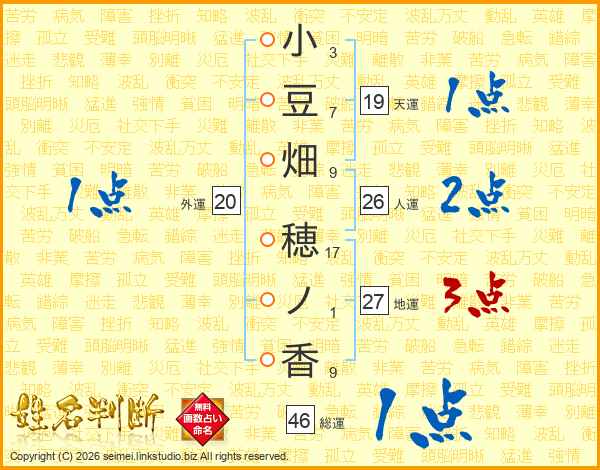 小(3画)豆(7画)畑(9画) 穂(17画)ノ(1画)香(9画)