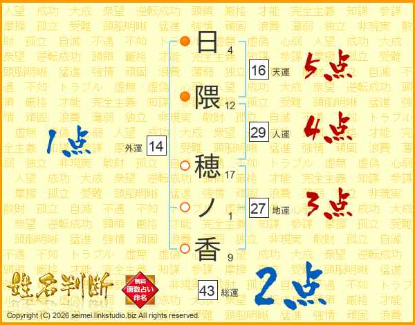 日(4画)隈(12画) 穂(17画)ノ(1画)香(9画)