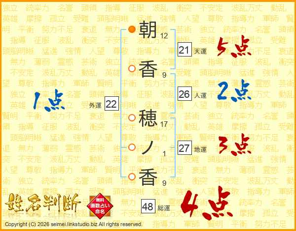 朝(12画)香(9画) 穂(17画)ノ(1画)香(9画)