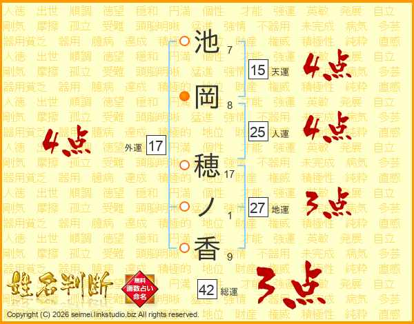 池(7画)岡(8画) 穂(17画)ノ(1画)香(9画)
