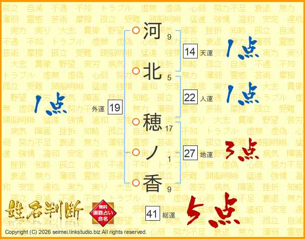 河(9画)北(5画) 穂(17画)ノ(1画)香(9画)
