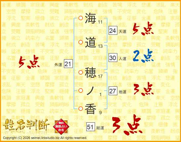 海(11画)道(13画) 穂(17画)ノ(1画)香(9画)