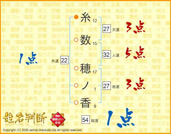糸(12画)数(15画) 穂(17画)ノ(1画)香(9画)